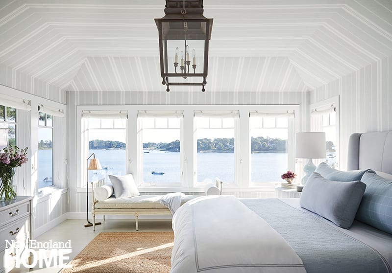 Bedrooms also advance what Tharp calls the house’s “ethereal envelope.” A dreamy first-floor guest suite is dressed in what she describes as “a tight range of white, creams, and neutrals.” Upstairs, an airy master bedroom that features upholstery on the walls and ceiling and three-directional views feels like a tent canopy floating over the water.