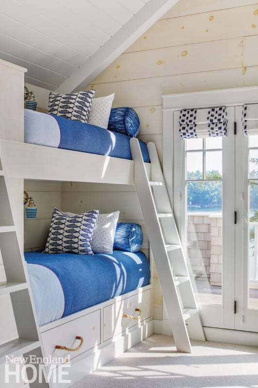 The home’s exterior is equally sturdy, built to withstand harsh northern winters. The couple worked with contractor Kevin Beland to achieve an authentic look with materials that won’t rot or mildew, including Azek trim and NuCedar shingles. “I don’t want them to have to worry about maintenance,” says Beland, whose firm has been building in the Lakes Region for four decades. “Vacation houses are supposed to be fun.”