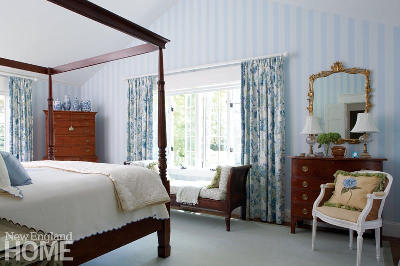 Make your way to the owners’ private quarters and the palette quiets down again. The bedroom walls are covered in a blue-and-white-striped Peter Fasano paper, and chintz curtains, also in blue and white, temper the sun in case someone wants a nap on the French directoire daybed. New French doors provide easy access to the patio and pool. The renovation also created an enlarged bathroom with a glorious shower, marble tile, and custom cabinetry.