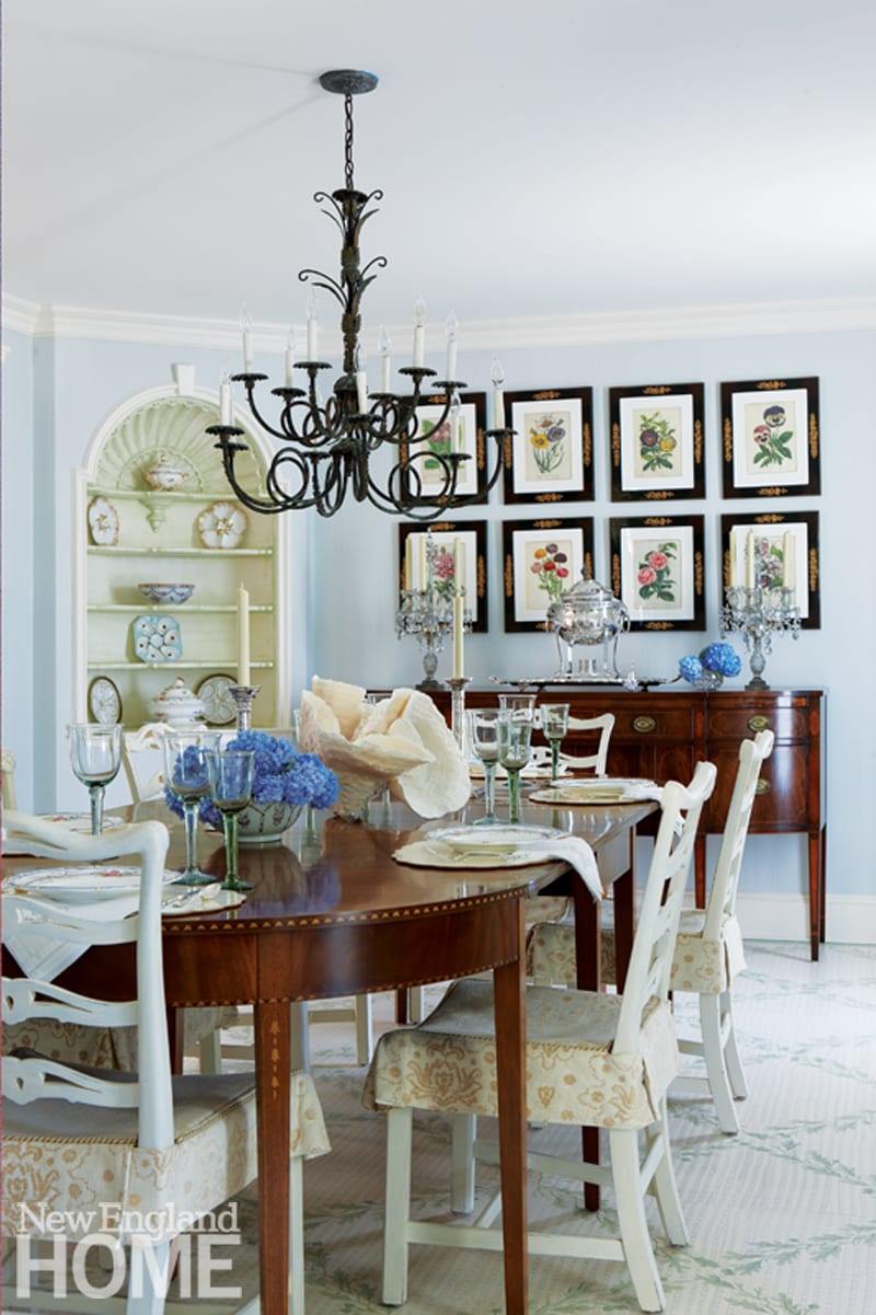 The nearby dining room exudes the same old-school, ever-so-comfortable vibe. It’s a room where, if you’re lucky, you might be invited for Sunday brunch or a holiday feast. The FitzGerald-designed floor, with its stenciled pattern of lattice, leaves, and berries hand-painted by James Alan Smith (who’s also responsible for painting the foyer’s dramatic floor), underscores the owners’ passion for gardening, as does a cache of botanical prints. The gleaming dining table and sideboard are antique. To accommodate the length of the latter, an existing door had to be eliminated. But as Ashworth jokes, “a useful sideboard is more important.” The slipcovered dining chairs—lest the room seem too formal—have been cleverly painted white.