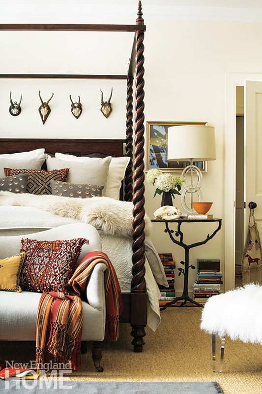 The master suite’s decor is another lesson in marrying disparate objects. A regiment of antlers parades above the mahogany bed, while a Lucite Mr. Brown double-ring lamp casts a beam for nighttime reading. The light shares the Giacometti-like nightstand with another skull, this time sun-bleached. There’s a Mexican serape draped over the John Derian settee and a Lucite-legged stool wearing a Tibetan wool seat.