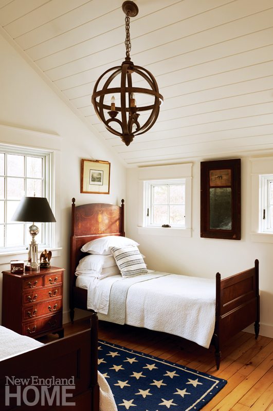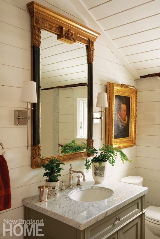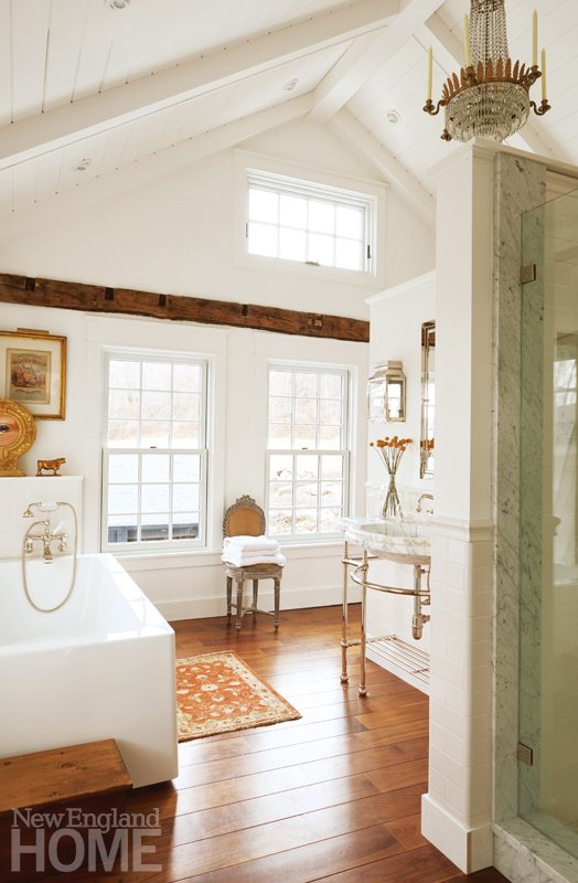 Upstairs, Kalur undertook some significant structural changes. The original layout included five smallish bedrooms, one bath, and an open landing at the top of the rear staircase. Kalur combined two rooms to fashion a large master suite at the front of the house, and removed the back staircase to make space for a second bathroom and laundry room. Both bathrooms are outfitted with fixtures from Perrin & Rowe. “We chose the fixtures because they were inspired by the Edwardian era,” Graham explains. “It was a time when sophistication and elegance were the standards in the finest residences. Yet they are timeless and complement the history of an antique New England Home.”