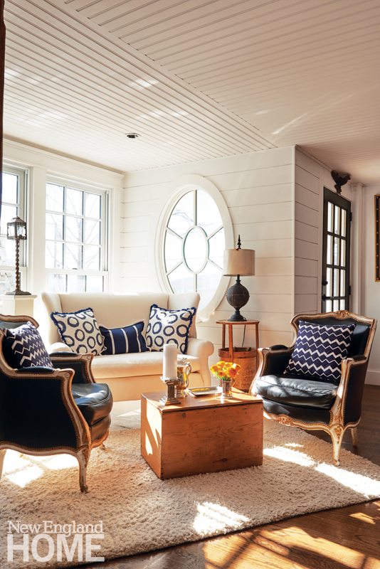 The kitchen occupied a small room at the back of the house, where the ceiling is at its lowest point. Kalur broke through several adjacent smaller rooms and closets to create an expansive workspace (which includes an eighteen-foot-long island), sitting area, and dining room. Shiplap walls and a beadboard ceiling add the illusion of height, and Kalur installed large windows above the sink for an increased sense of space. A pair of salvaged gable-end windows Graham scored from a Westport builder also found a home in the kitchen, ushering in light and framing the lovely views.