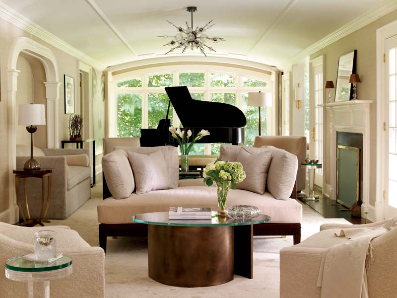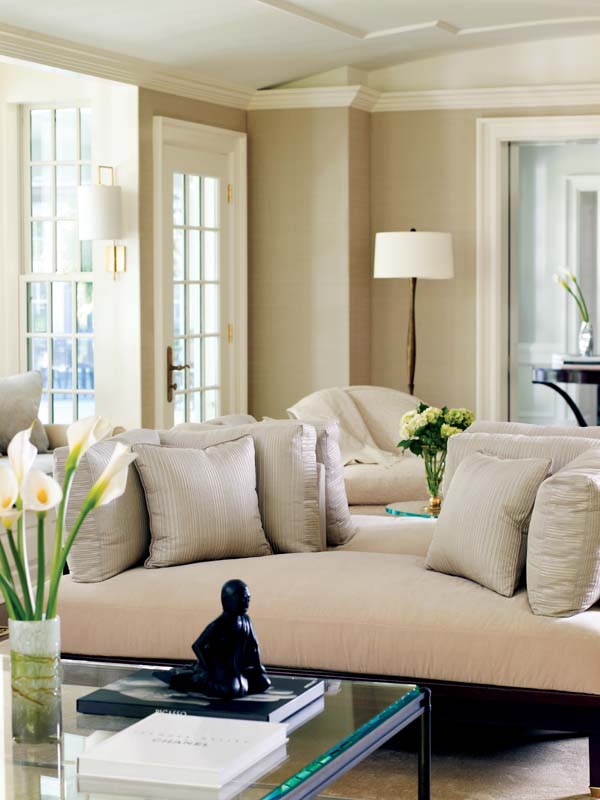 Quiet drama reigns again in the formal living room, where the designer made the most of the long, narrow space. “This proved to be the most challenging room of the project because of its size,” says Ruderman-Rosier. “My intent was to create three different seating areas, yet make the room feel very interactive when occupied by a large group.”
