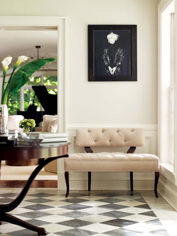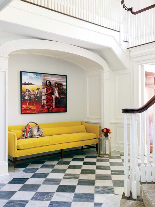 The foyer establishes that peaceful sensibility right away with walls painted a quiet neutral set off by handsome millwork in a crisp white. Such tranquility doesn’t preclude a dose of the theatrical, however, in the form of a vivid painting by Australian artist Tracey Moffatt, which hangs above a clean-lined sofa the color of a Meyer lemon tucked in a niche along one wall. The black-and-white marble floor adds further excitement, pulling the eye through the space and into the heart of the house.