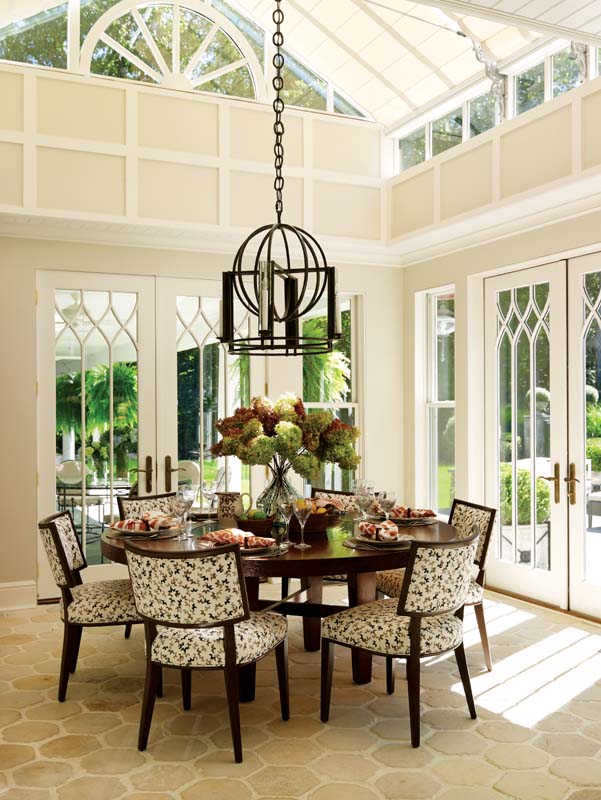Nowhere is the connection between indoor and outdoor environments more evident than in the airy double-height breakfast room off the kitchen. Windows on two levels and multiple French doors that open to the landscape convey the feeling of being in a large, luxurious greenhouse. The strong rectilinear elements of the room’s architecture are softened by the curvaceous table and chairs and the hexagonal floor tiles.