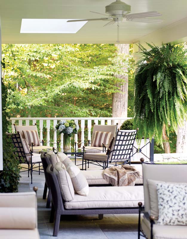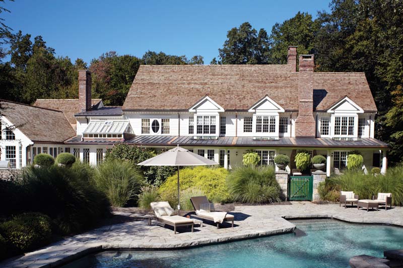 One set of French doors looks out on a terrace, where the JANUS et Cie table and chairs seem to mirror their indoor counterparts. The terrace is part of a creative landscape, designed by Ruderman-Rosier along with Wesley Stout Associates, that weaves together native plantings, verdant lawns and architecturally inspired planters overflowing with colorful blooms.