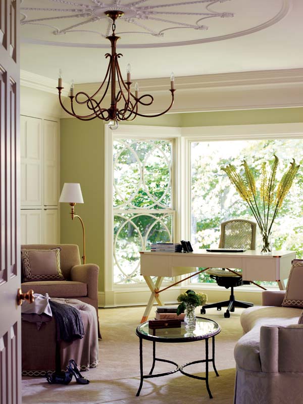 The importance of the outdoor environment comes into play again in the master suite, where Ruderman-Rosier integrated the views into her design. In the sitting area, three windows behind a desk have been left bare to allow maximum exposure to the outside. The large center picture window that frames the custom contemporary desk is bordered on either side with double-hung windows adorned with a circular motif. That delicate scrolling is echoed in the ceiling medallion and chandelier, as well as in the sleeping-area fabrics that drape the windows and cover the bed.