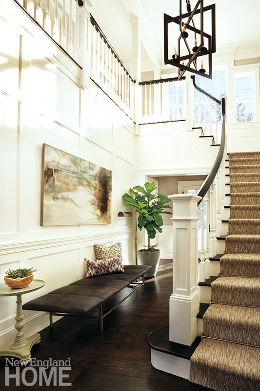 Inside, Smith’s architectural detailing strengthened the classic colonial entry with boxed paneling, additional columns, and the replacement of several half-round windows with a trio of more-suitable rectangular styles. Hullinger struck a modern chord by hanging horizontal artwork across the boxed paneling, adding a stair runner with pewter-hued tread rails, and crowning the space with an edgy lantern fixture with modern geometric style.