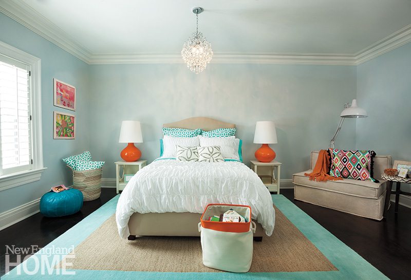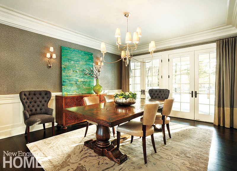 “There is a certain level of tradition—symmetrical colonial trim profile and moldings—juxtaposed against more-contemporary light fixtures and wall finishes, which works really well,” says Smith. “The house is not stuffy; it’s light, bright, casual, with almost a modern feel to its interiors.”