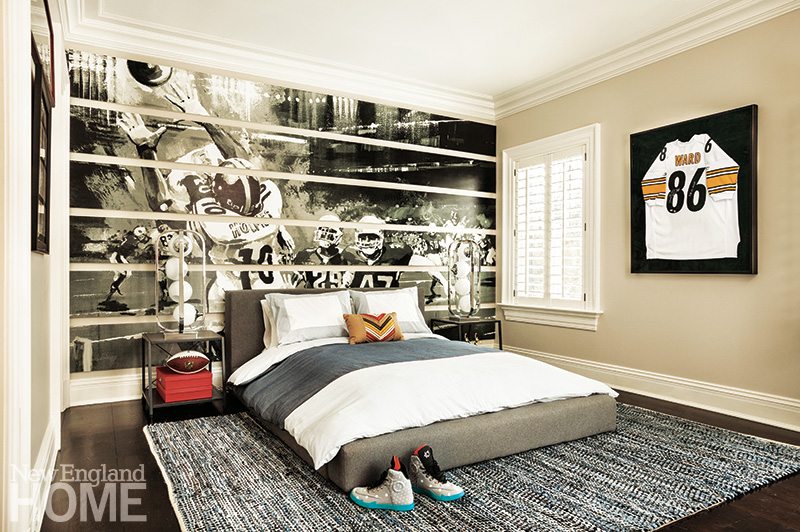 Down the kitchen staircase lies a newly excavated basement that holds an entertainment room filled with multiple hi-tech screens, scoreboards, and a bar, as well as a fitness room, wine cellar, and bathroom. Half the house was razed to create this little piece of heaven for Rob and the couple’s sports-minded children. It also serves as a gathering place for members of the New Canaan Youth Basketball teams for which Rob is president.