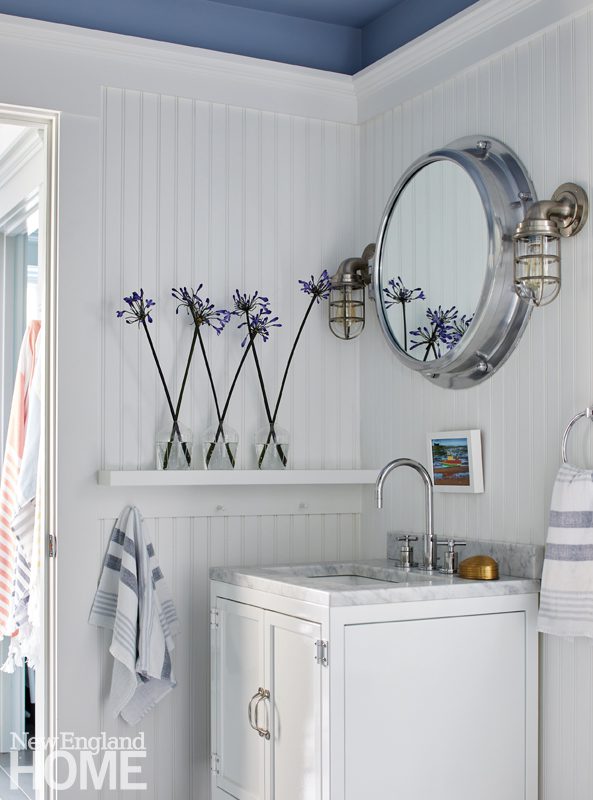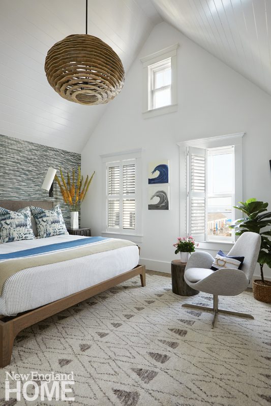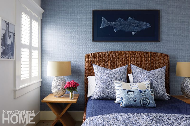 The refresh mostly leans on what Acevedo calls “modern coastal” furnishings with clean lines and organic fabrics that, yes, are very much at home by the sea: wool, cotton, and sisal. The nautical wall on the second-floor landing features a mostly traditional arrangement of blues and grays, with a pair of oars for accent and a wreath made of model boats by artist Maralyn Menghini for a sense of place. Carpenter Liam McCooe added a new island and coffee bar in the kitchen and built-in cabinetry in several rooms to further customize the space.