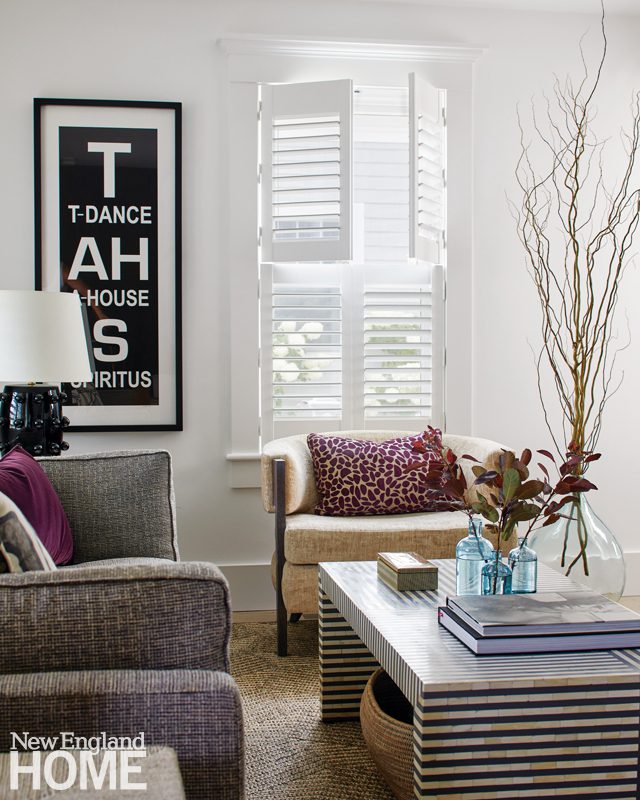 As one might guess from the name, Shor Home Furnishings & Interior Design is no stranger to the sea. When called upon to reimagine the interior of a late-nineteenth-century home built in classic coastal colonial style, however, some piquant purples found a place amid the sand-toned rugs, framed fish and wave art, and blue textured wall-paper reminiscent of rippled water.