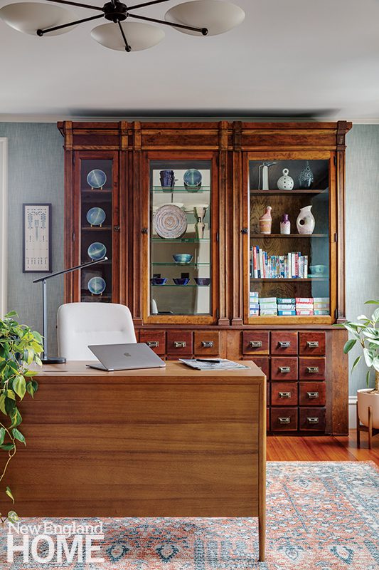 The former library became the dining room, where the owner displays his collection of memorabilia related to the house’s heritage. “I’m interested in history,” he says, “and I’ve enjoyed doing research on the historic nature of the home and neighborhood.” An entire wall is dedicated to carefully collected photos and documents telling the stories of past occupants, among them a surgeon, a Harvard coach, an abolitionist, and a suffragette.