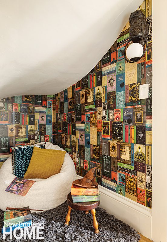 For the children, there is a reading niche with a Harry Potter motif under the main staircase, and a playroom on the third floor that offers a subtle history lesson as kids navigate a climbing wall covered with depictions of Boston landmarks, some built before and some after their own house.