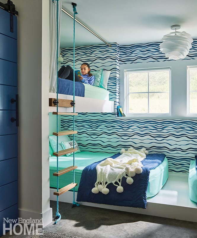 Space was, of course, an issue—but, for Crestin, it was also an opportunity for creativity. Since the Donovans have three kids, maximizing square footage—and seating—was key. An extra-long sectional anchors the main room, the dining nook sports a custom oversize table and banquette seating, and the kitchen’s efficient U-shape design incorporates plenty of storage as well as counter stools for casual dining. Downstairs, a chic bunkroom (complete with rope ladders and bunk curtains for privacy) is the ultimate-space saver, as restrictions allowed for only two bedrooms.