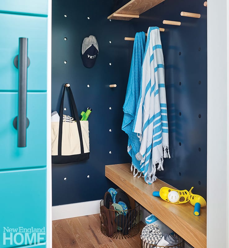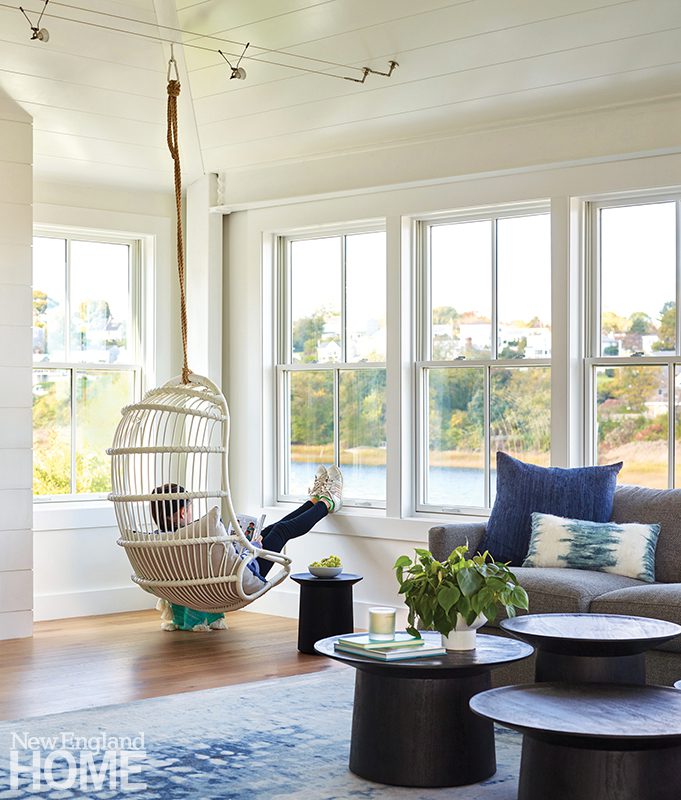 Time had taken its toll on the tiny summer house built on pillars and posts, and in 2017, Gerry and his wife, Lyndie, decided to start fresh. They enlisted architect Ben Nutter, who came up with a clever split-level design as he skillfully navigated the choppy waters of lot-size limitations, view restrictions, and a sloped site. And to realize their aesthetic vision, the couple brought in designer Kristina Crestin. “Our [primary] house is old, built in 1900, a colonial, and very traditional,” says Lyndie. “I wanted the exact opposite for down at The Neck.”