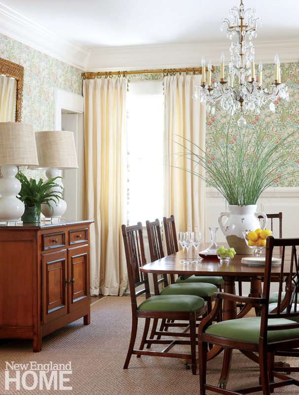 The living and dining rooms have a more formal appeal, yet still feel comfortable. Luxurious fabrics and furnishings create a nice interplay with the textured rug. A decorative painter transformed the dining room’s white built-in cabinet, giving it the look of a beautiful antique piece of furniture. Hand-carved custom chairs from London flank the dining table, but “to keep the house fresh, crisp, and young,” says Rogers, the designers went bold with an apple-green mohair upholstery. And the pièce de résistance? An intricate, hand-blocked William Morris wallpaper, a nod to the nearby Pequot Library.