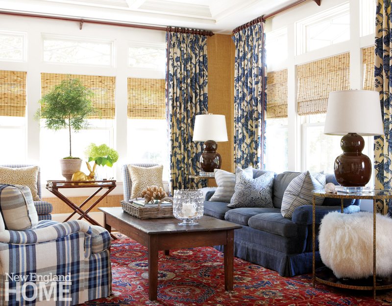 The family room makes a perfect illustration of this notion of mixing new with old. Hilary and Damien had a favorite carpet from their previous home that they wanted to incorporate. The designers used it as a launching pad, pulling its navy and cream to create a casual coastal vibe. To add texture, they covered the walls in grasscloth and hung bamboo blinds on the two big banks of windows.