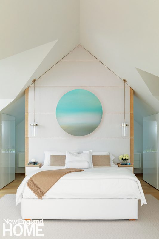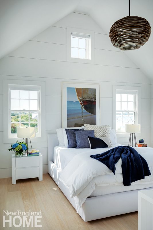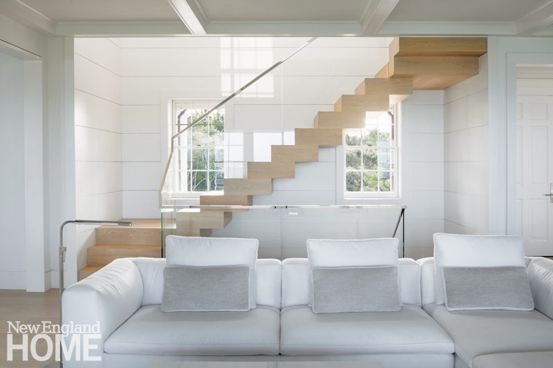 To encourage an unfussy, relaxed atmosphere, Dunne Marcoulier landed on a clean palette of mostly white, warmed up by textural fabrics, stone, shiplap, and oak accents. A mix of custom and contemporary furnishings complements the minimalist interior architecture. “There’s a bit of that California aesthetic, as well as European,” says Dunne Marcoulier. “It relates to Nantucket, but you feel like you could be on a yacht in Europe.”