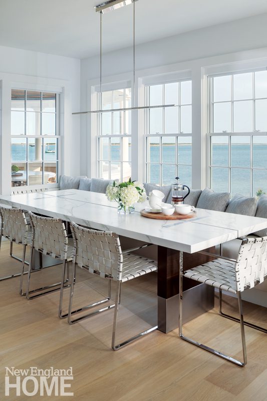 With planning and structural approvals out of the way, attention turned to the interiors, led by architect and designer Elizabeth Dunne Marcoulier. She and MacEachern collaborated on the floor plan, opening it up as much as possible to capitalize on the views. “This house needed to be all about the water, the amazing sunsets, and indoor/outdoor living,” says Dunne Marcoulier, who had worked on the family’s primary residence in Boston many years ago while at Dell Mitchell Architects but never actually met the couple.