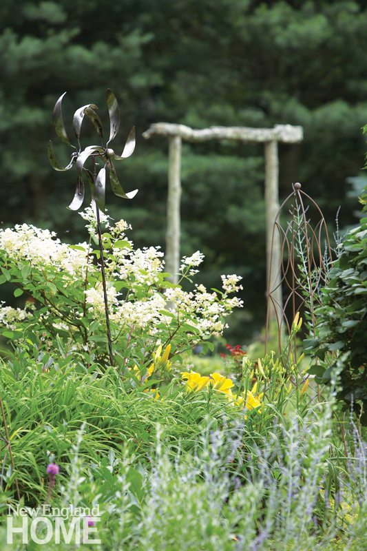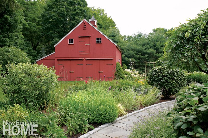 As she did with the interiors, Monahan—with help from garden designer Angelo Maldonado—edited the grounds. “We took out a lot of plants that had lost their shape and replaced them with ones that would provide more interest,” says Maldonado. A once-busy bed at the base of the front porch now contains a blend of crisp boxwood and blue hydrangea. The last speaks to the color of the welcoming front door. Perennials mingle along the stone path to the barn. And rising amid the heady blooms are three arbors patinated with lichen. “They were here when we arrived, and they’re getting ever more fragile. But, I love how weathered they look,” says Monahan.