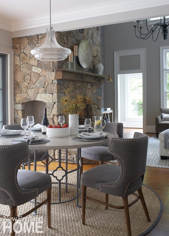 Vetoing a stuffy living room is one thing, but losing a dedicated dining room would have been a different story, especially come the holidays. The existing red walls and bright white trim, though, didn’t fit with Monahan’s fresh and more modern tempo. Taking the setting from cozy to sophisticated, she clad the walls in a metallic grasscloth by Phillip Jeffries and covered the floor with a sisal rug that adds texture. The plank table and straight-backed chairs—newly slipcovered in linen—hail from the family’s previous home. Mercury-glass pendants dressed in chainmail replace yesterday’s crystal chandeliers. At night, the twin fixtures glow like stars.