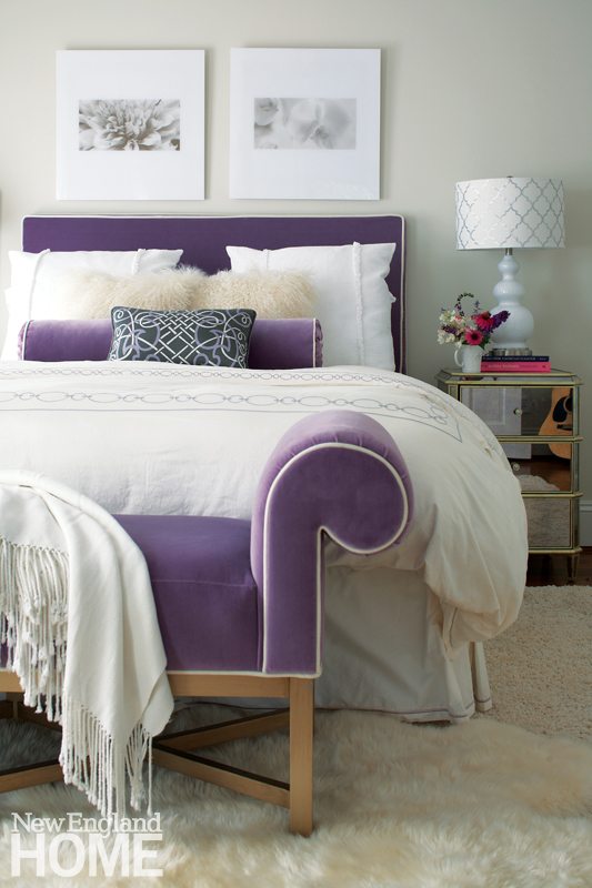 On their frequent visits, the couple’s two grown daughters claim bedrooms on this level as well. “Given a choice of rooms, they both ask for the one with a view of the barn,” Monahan says. Still, as appealing as those vistas are, this favorite room also entices with a heavenly bed upholstered in a hue reminiscent of spring-blooming iris. Drexel Heritage mirrored nightstands lend some girly glamour.