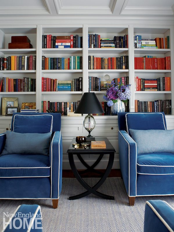 But if the dining room is all about gathering together, the refurbished library is where people head to read their novels or watch a movie. Velvet armchairs with snowy piping exude comfort. In its former life, the book-filled space was a somber, cherry-paneled study. “We painted the walls, shelves, and coffered ceiling to lighten it up,” says Monahan.