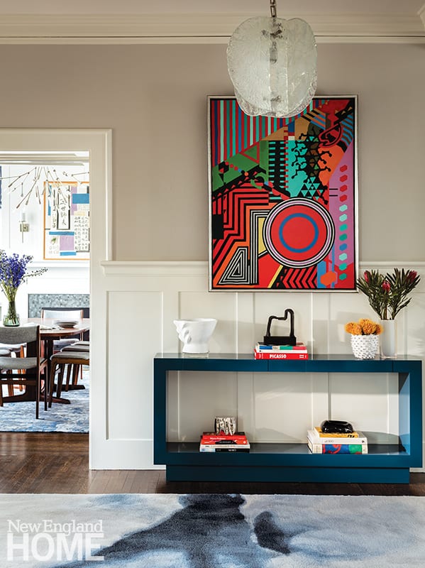 While most of the first floor leans toward cool blues and blue-grays, Kaplan cranked up the volume in the study with walls painted Benjamin Moore Blue Suede Shoes. She filled it with a quartet of spinnable plush chairs upholstered in burnt-orange wool, and an extra dose of what Kaplan calls “my crazy, colorful mix of materials and art.”