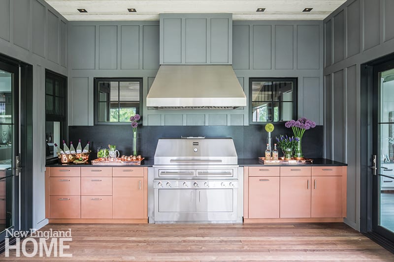Debra and Robert Gottlieb had a fairly lengthy wish list to ensure their Berkshires dream home would be a welcoming retreat for family, an entertaining haven for friends, and a showplace for Debra’s design talents. The five-acre lakefront property could easily absorb a significant spread, but the couple felt strongly that the scale of their new house not overwhelm the neighborhood. To solve the competing directives, architectural designer Ritch Holben expanded on Gottlieb’s vision for a modern barn by creating three distinct but connected gable-roofed buildings that evoke traditional barn forms. “The concept is based on the collected structures of typical New England farm compounds,” the principal of RhDesign says.