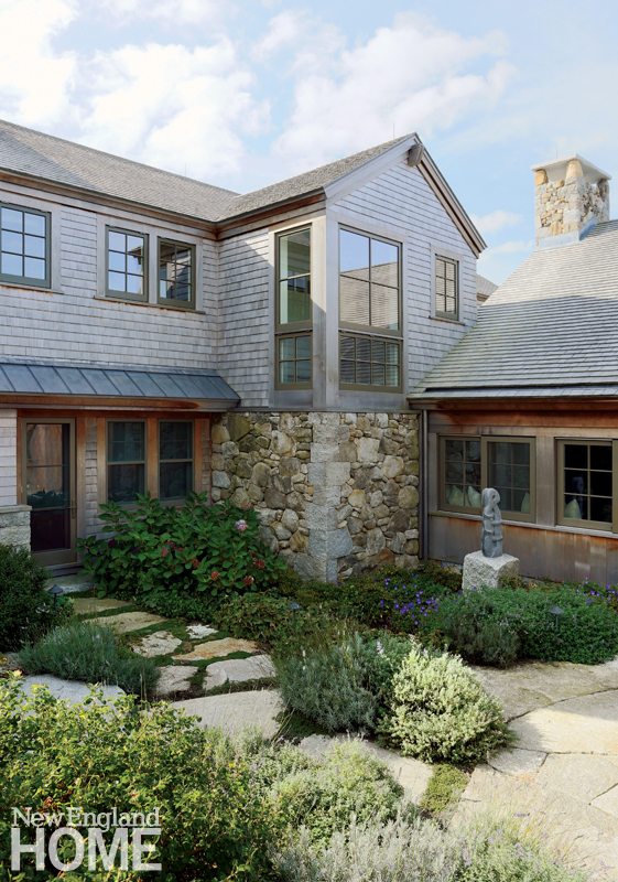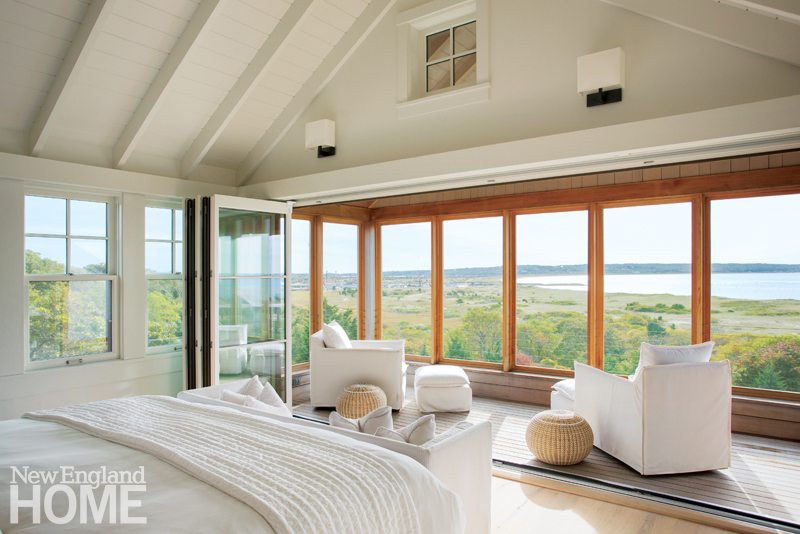 Visitors make their way via boardwalk through the north wing of the new building, known as the dairy barn, into a protected fieldstone entry courtyard. Not until the front door opens on the main house and one steps into the great room do the staggeringly beautiful vistas come into play. A continuous wall of windows showcases Vineyard Sound. “When you’re in the house or on the lawn, you’re drawn to the sweeping panorama of the shore, while the driveway passes unobtrusively fifteen feet below you,” Horiuchi explains.