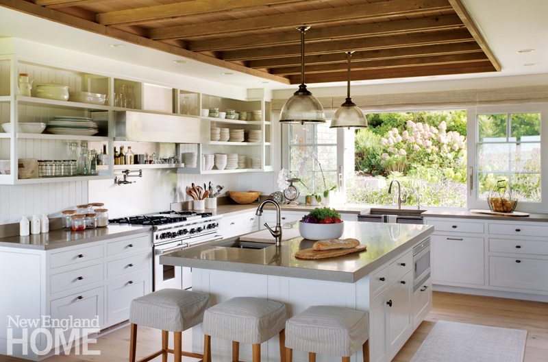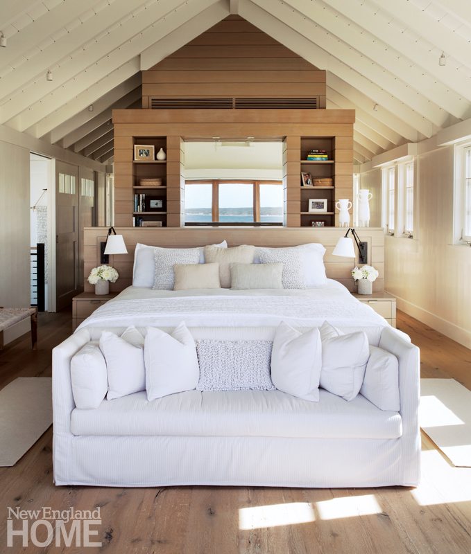There’s another praiseworthy feature as well: “We derived a story,” says Regan, explaining the room’s attention-getting centerpiece. “Old homes always had an attic, and summer visitors would end up using it. The core element we added is like a storage box you’d find up there.” Hardly a box, the ingenious horizontally paneled volume contains the couple’s walk-in closet and water closet. And behind unfolds their tumbled limestone-floored bath.