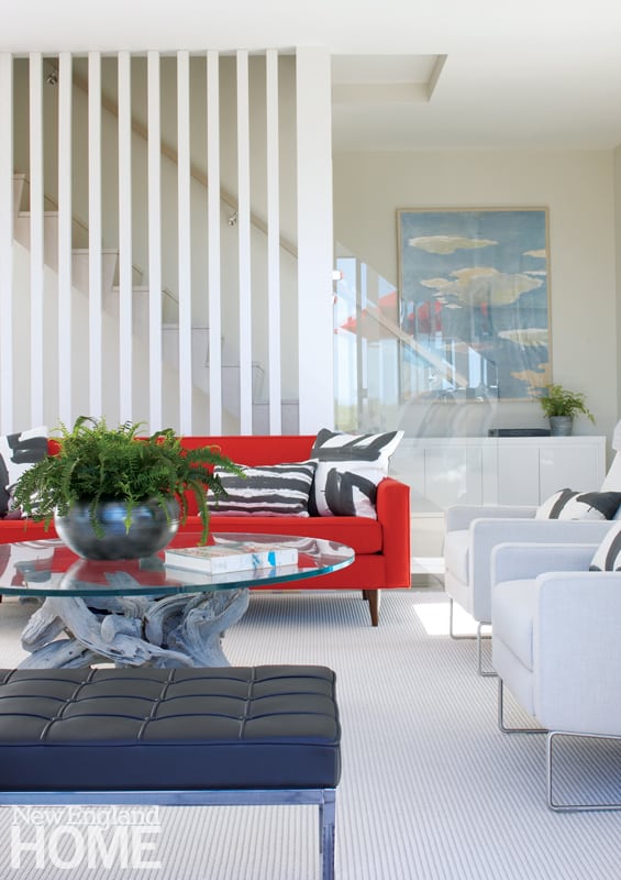 “We wanted the architecture and interiors to be a little bit on the quiet side, so as not to compete with the beauty of the natural surroundings,” says Cutone, who nevertheless couldn’t resist inserting a cherry red sofa into the mix. “I just thought, with all the whites, blacks, silvery grays, and chrome, that we needed a punch of color somewhere.”