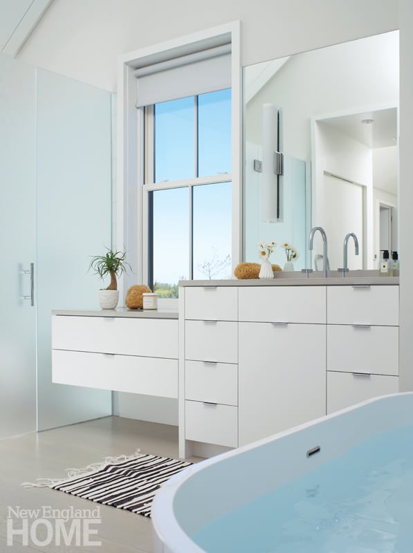 In keeping with the wife’s mission to simplify the house, much of the furniture is built in. “The rooms aren’t super huge, and by using built-in furniture you maximize efficiency,” explains Cutone, whose custom beds appear to hover over the floor, making the rooms look bigger. While both master bathrooms have a shower, hers includes a freestanding elliptical tub with a breathtaking view of the undulating, flower-dappled dunes. (“I never use the shower,” the wife declares. “Ever.”)