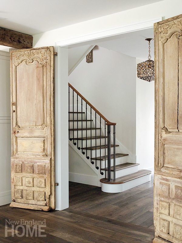 That was never going to be the scenario for Anne-Laure and Sean Martyn. They had definite ideas for the house they wanted to build on their New Canaan property, a lovely chunk of land ribboned with old stone walls. From France and Ireland, respectively, the couple, who have made the U.S. their home for the past decade, envisioned a cedar-roofed white farmhouse, perfectly in keeping with the New England vernacular. The interior architecture was to be modern and uncluttered, and the furnishings would incorporate reclaimed materials and salvaged architectural features. Anne-Laure, a designer who heads up her own firm, says her aim was “to create an atmosphere of timeless elegance.” Oh, and another thing: they wanted a memorable staircase, such as you’d find in a French country house.