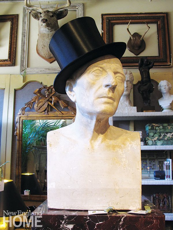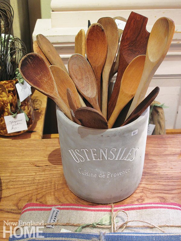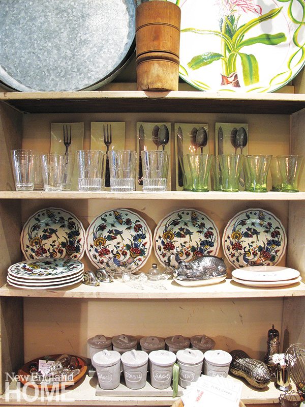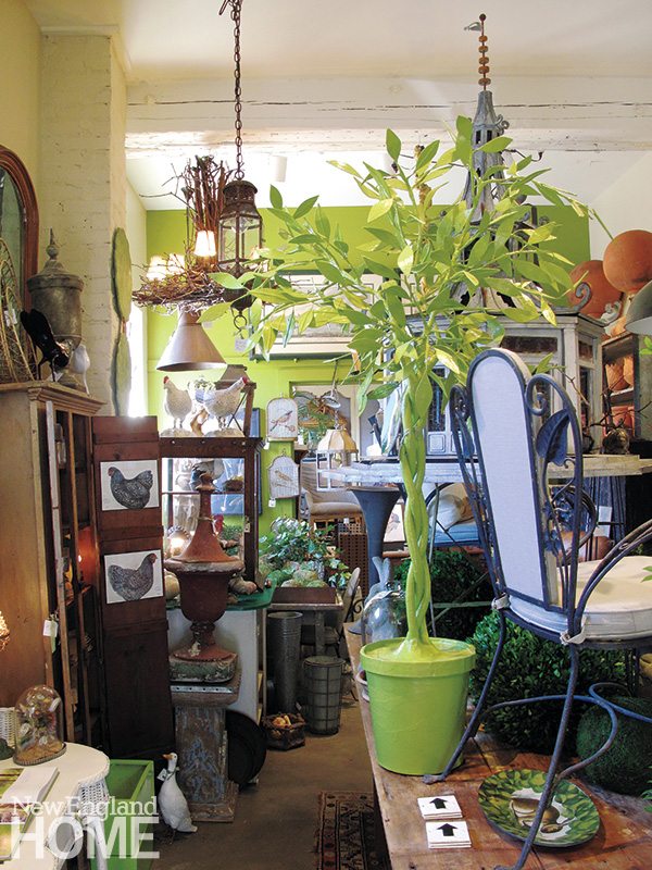 On a recent visit, a bookcase as blue as a perfect autumn sky was laden with four clay ducks, two wooden planters, and an array of straw baskets. Portraits, still life paintings, old signs, and mile-long banners offered instant ancestry. Francophiles with Limoges leanings or Parisian preferences would be delighted by stacks of Astier de Villatte earthenware, Provence plates, and glassware suitable for both rouge and blanc. And then there’s the topiary and all manner of garden containers.