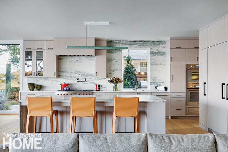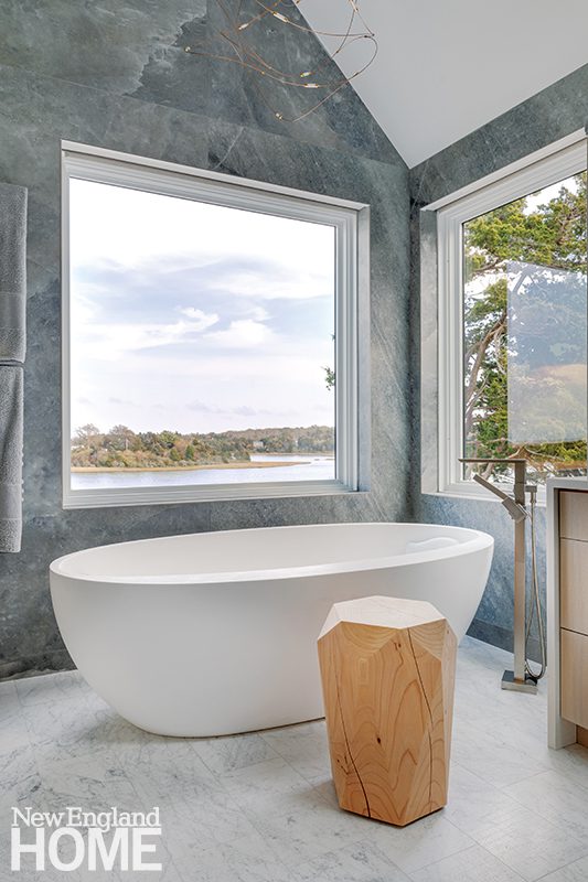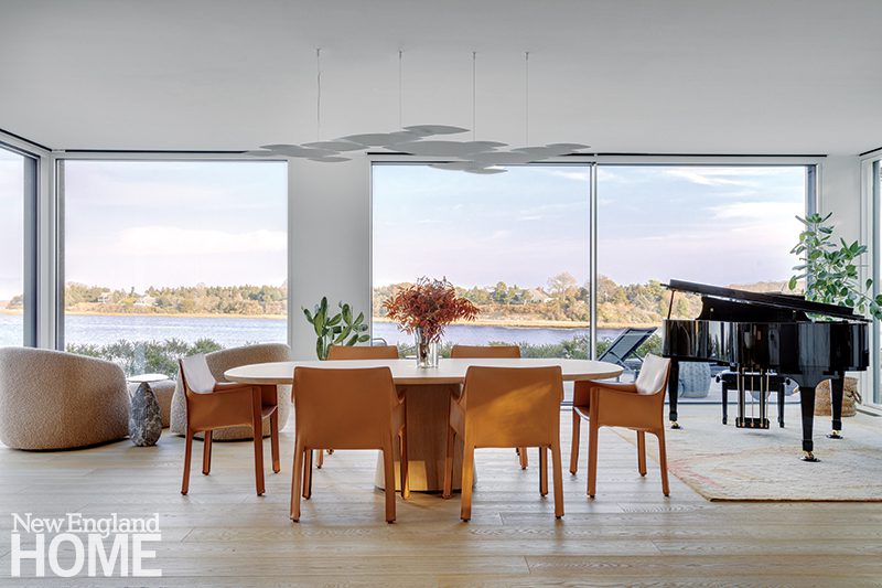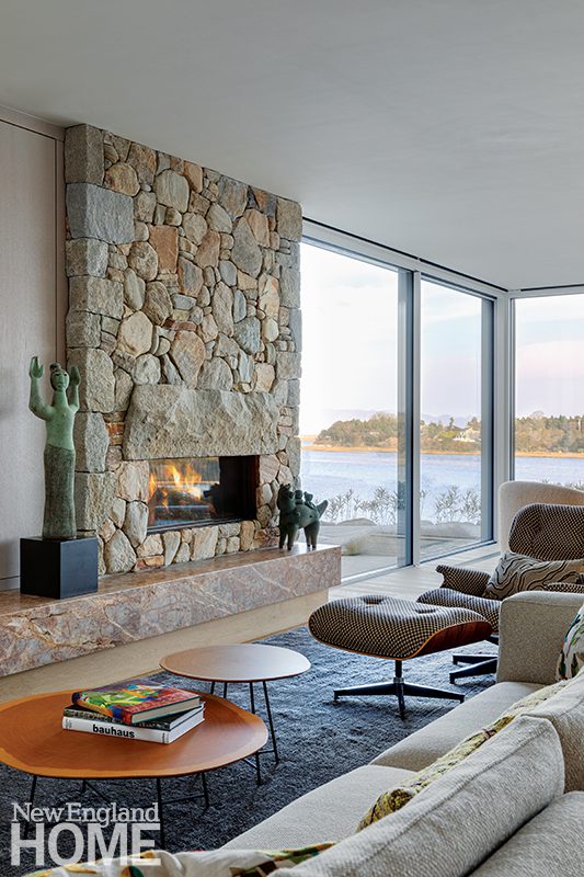 To imagine the 6,000-square-foot, six-bedroom residence and 2,400-square-foot guesthouse, the couple enlisted John Day, who was a partner at LDa Architecture & Interiors at the time. In response to updated zoning regulations, the team “reused the foundation of the previous structure in order to keep the house as close to the cliff as possible,” explains Day, now a principal at Blue Hour Design, where the project was completed. “The classic materials and gable forms are synonymous with New England, but the lines are more contemporary.”