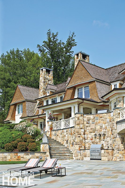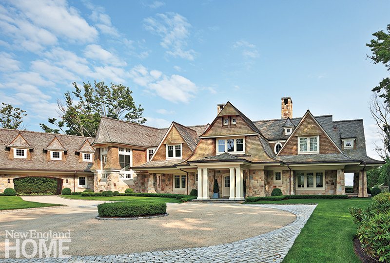 A series of gracefully sloping gables helps bring cottage coziness to an expansive coastal Greenwich home.
