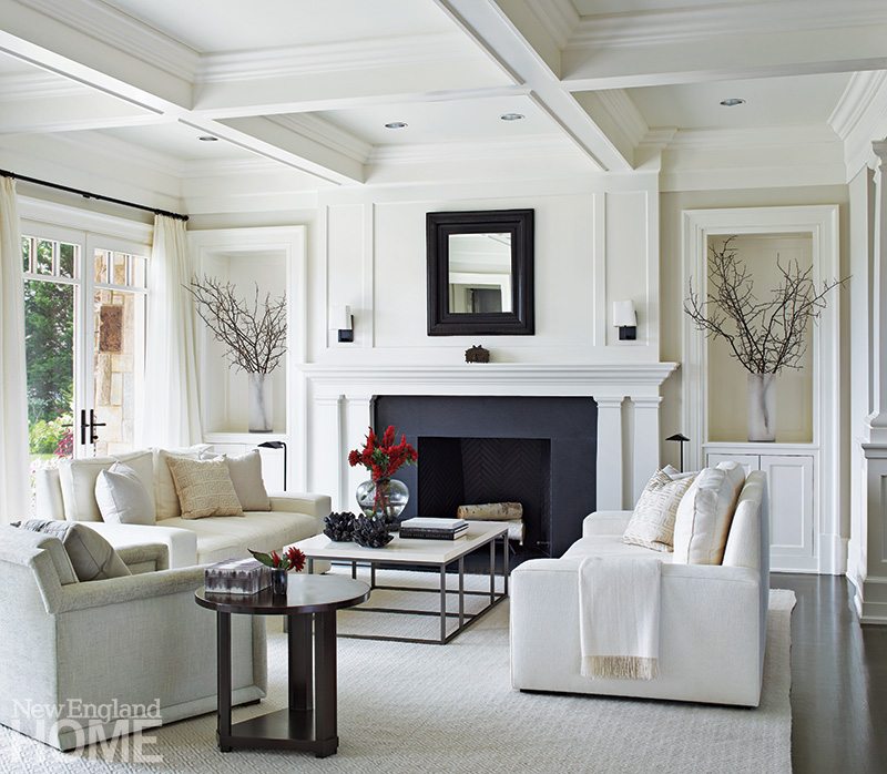 If you imagine the interiors as the icing on a decorative cake, the crown, base moldings, wainscoting, and beams have been spread smooth. “The focus was on creating an axis from one space to another in the open floor plan,” says McClung. “The architectural details, such as the beams and fireplace mantels, were kept really clean.”