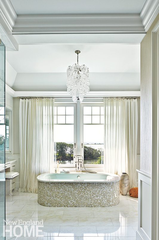 From the master bedroom spreads a broad view of the cove and sound. Draperies in the softest lilac match sunset hues and complement a custom blue-and-white rug. In the regal master bath, the softest white sheers hang from floor to ceiling behind a mosaic-covered standing tub.