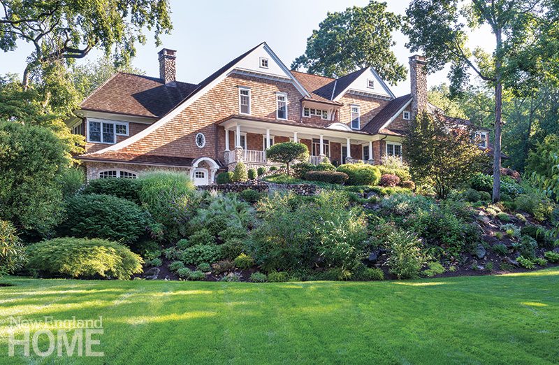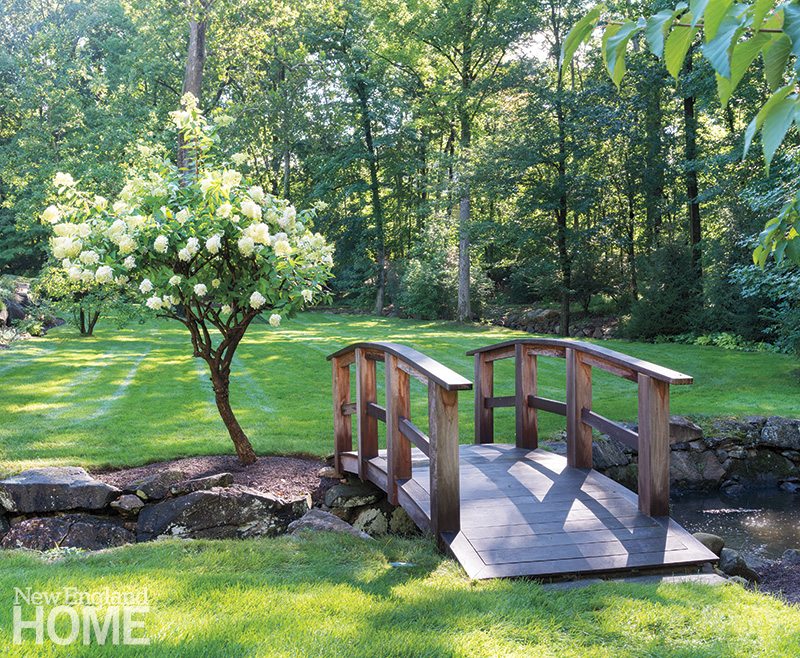 The water is rushing this autumn morning, whooshing against the mossy sides of a stone creek bed and under an arced wooded bridge. On the clipped front lawn of the four-acre property, hydrangea trees cling to their last blossoms. The backyard pond lies calm—except for the fountain sending up its dazzling rainbow spray—and dotted with the first fallen leaves. The bucolic setting, complete with bird calls, would lead you to believe you were on an old Litchfield County estate rather than smack dab in the middle of Darien.