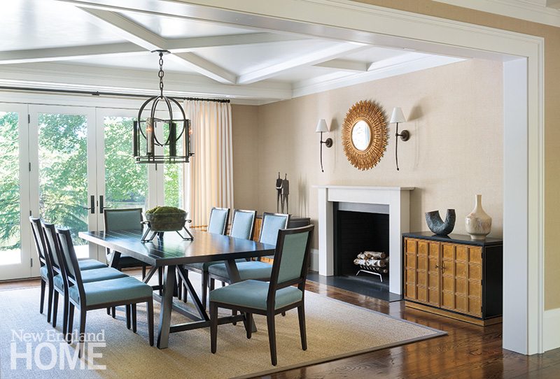 The flow fits the family’s love of entertaining. While the narrow living room’s loose arrangement feels designed for cocktails and small bites, the adjacent dining room with its upholstered chairs invites lingering. Flanking the room’s commanding mantel is a pair of 1950s gilded chests holding sleek ceramics and a sculpture. On the opposite wall, two cages of iron and glass hold the couple’s wine collection. “The clients had seen Jennifer Aniston’s grotto wine cellar in a magazine and loved the idea of having a wine room in the dining room,” says Manchester. “A stone grotto would’ve looked crazy, so we did the cages with the metal grid.”