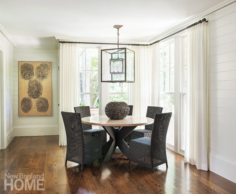 Up the stone steps, past the shingled porch, and into the foyer the transition is subtle. Paneled walls with barely-there crown and base moldings signal a break from the past. Through the foyer to the right lies an open, formal living room that flows into the dining room and beyond to a leather-paneled billiards room and the husband’s office, with its hunting motif.