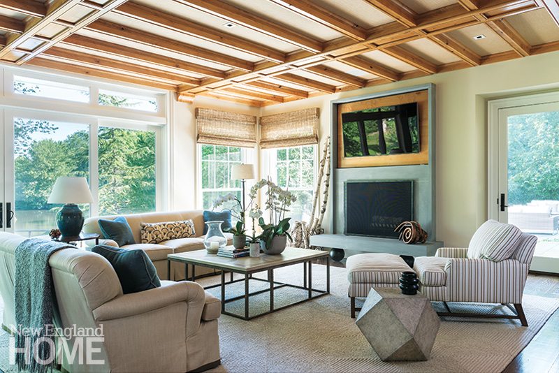 Nowhere is that view on bigger, better display than in the large family room. Here Burin removed a roof gable, dropped the vaulted ceiling, and installed knotty alder beams, creating extra space for the new master bedroom that wraps over the top of the house. In contrast to the traditional look of the ceiling, the fireplace takes a contemporary tone, with its hearth made up of a single slab of bluestone balanced on eight-inch steel balls. A modern coffee table pairs with more-traditional, rounded-arm sofas and chairs, while the wool rug and grasscloth blinds keep the look casual. The designers kept the palette quiet, letting texture, rather than color, provide visual interest and a sense of warmth.