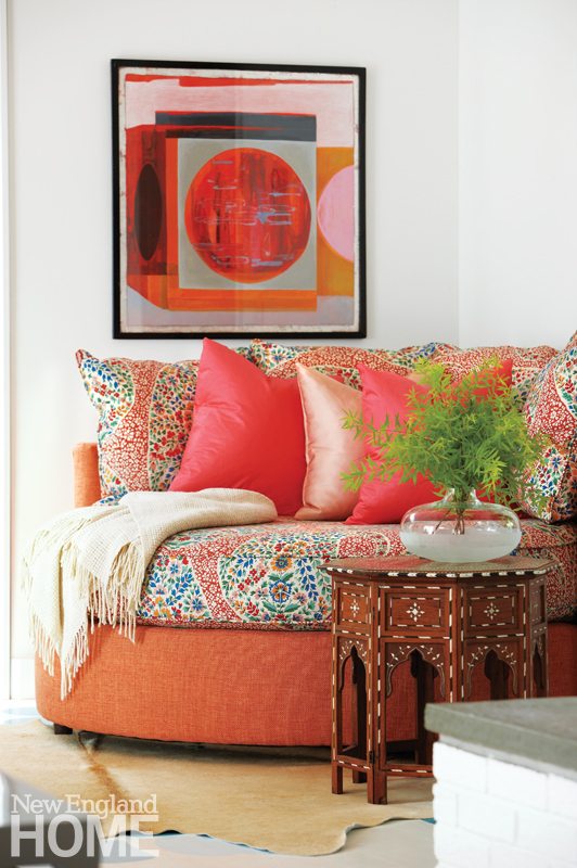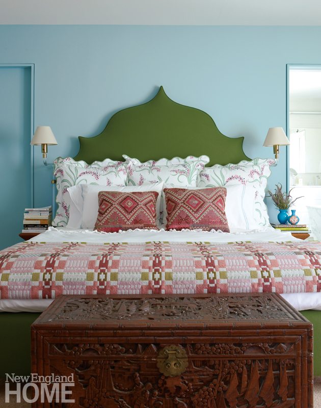 The walls in a quirky bedroom are papered in blue stripes; the bedcoverings are mismatched, and a bright red Moroccan rug knits it all together. In the master suite, a custom headboard with arabesque notes, a colorful coverlet, and pillows evoke that Moorish vibe. A baby’s room features red-and-navy patterned William Morris wallpaper and another bright rug underfoot. “It all works,” says Combe. “The nice thing about a second home is you don’t fret quite as much about everything ‘going together’ . . . it’s fun to have something different and cheerful.”