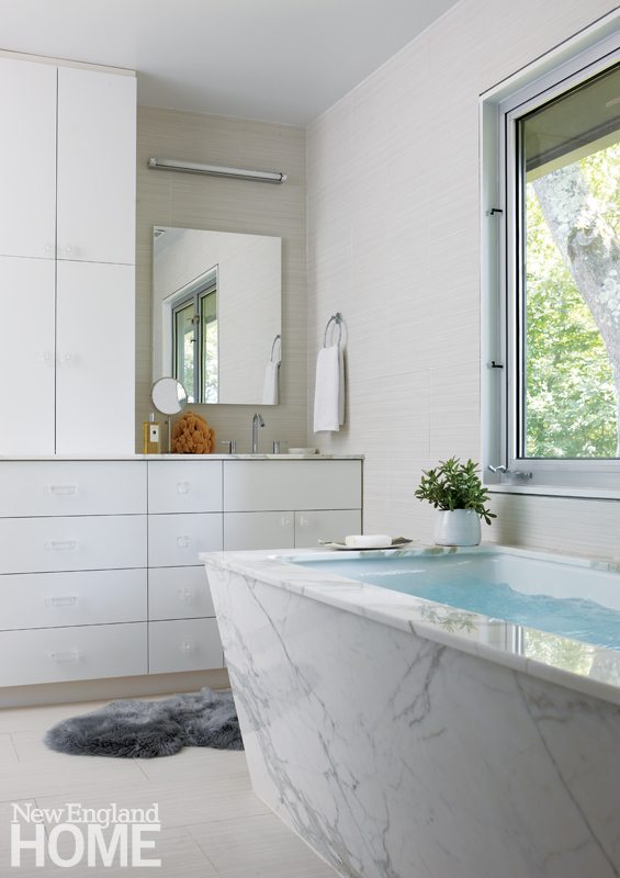 They reconfigured rooms and added 1,200 square feet of living space, including a modern, family-size kitchen. They brightened every dark corner. “It had such untapped potential,” says Storm. “The Connecticut countryside demanded large openings directed toward the view of the trees and sky. The land was amazing.” New fenestration throughout enhanced the views and reinforced the home’s link to the outdoors. They simplified the interiors in part by painting all of the walls, as well as a wood-paneled ceiling, white. “There’s a brick fireplace. Not really great, not magical,” says Storm, “so we painted it white, too, and now it’s a perfect backdrop.”