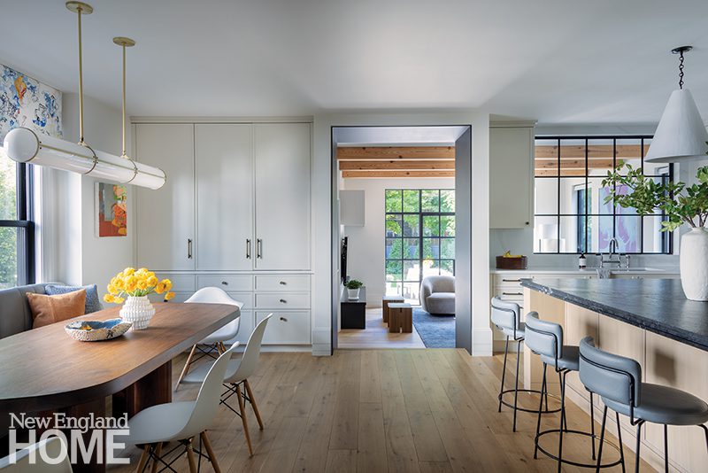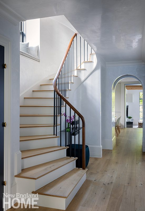 The interior was gutted and rebuilt, its upgraded windows and doors paired with simple fumed white-oak flooring, and its hallways and stairs wrapped in lustrous Venetian plaster. “It’s a great surface for a very busy house,” notes Elms. “It’s very forgiving.” Durable, family-friendly materials like mohair and wool stand up to abuse, as does a vinyl banquette in the kitchen.