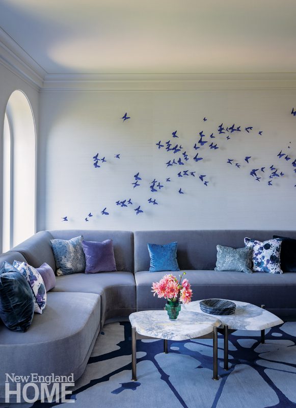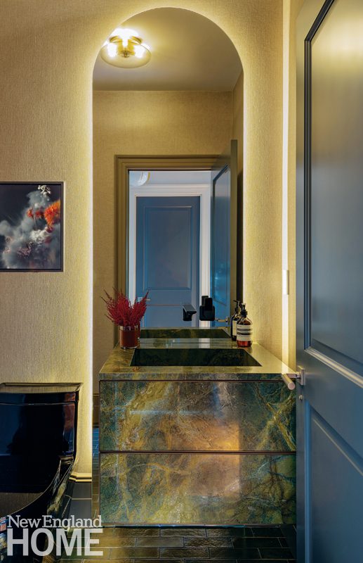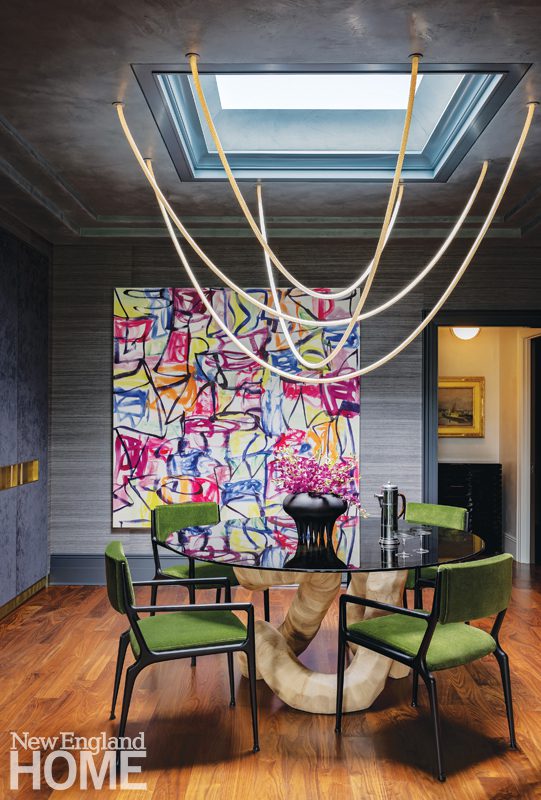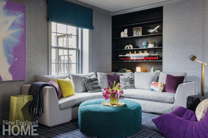 The well-traveled homeowner wanted something comfortable but current. “He’s great at not overthinking things,” says Elms, “which made it easy to do our job.” A deep dive into his personal aesthetic revealed a penchant for saturated colors like aubergine, teal, and green, which appear perhaps most prominently in the completely remodeled kitchen (he actually pushed for the teal pony-fur bar stools) and in the office and dining room. It’s the long, narrow office, with its views of the Charles River, that enthuses Ryan Garrity, vice president of Sea-Dar Construction, the most.