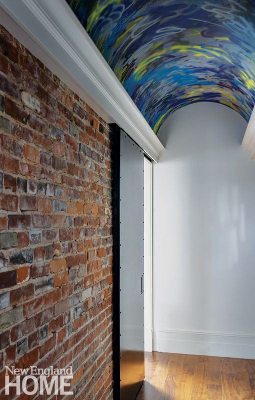 Elms got creative with some of the home’s other original elements, including the brick-lined hallway that connects the kitchen and hang-out space (where the homeowner gathers with his adult children to play poker and, yes, build a LEGO model of the Titanic). She reached out to decorative painter Pauline Curtiss to cover the hallway’s barrel-vaulted ceiling in a graffiti pattern that highlights the home’s colors, including fun pops of chartreuse.